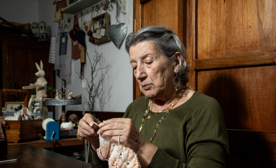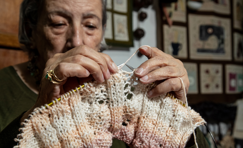 “Mamá siempre está haciendo algo”, nos cuenta Elisa, quien intenta acordarse de algún instante en donde la recuerde descansando y no lo encuentra. En su lugar, deja que su mamá nos vaya contando que es hija de Felicidad Botero, una mujer de Santuario, Risaralda, y quien osó con valentía separarse de su esposo en 1954 y criar a sus tres hijos sola. Una fuerza que, en todo caso ya venía con su sangre, porque su propia mamá quedó viuda con su séptimo hijo en el vientre y, también, los crió a todos a pulso. Ella misma tuvo que vérselas desde joven por sí misma y, siguiendo una oferta de trabajo de la Caja Agraria se fue de la casa antes de cumplir los 18 y empezó su vida en Circasia. Quizá por eso es que la dulzura que tiene Clemencia la tiene en las manos, cuando toma sus agujas y se entrega al punto de cruz, el crochet, el bolillo, el calado noruego o la malla para TEJERLE algo a quien quiere.