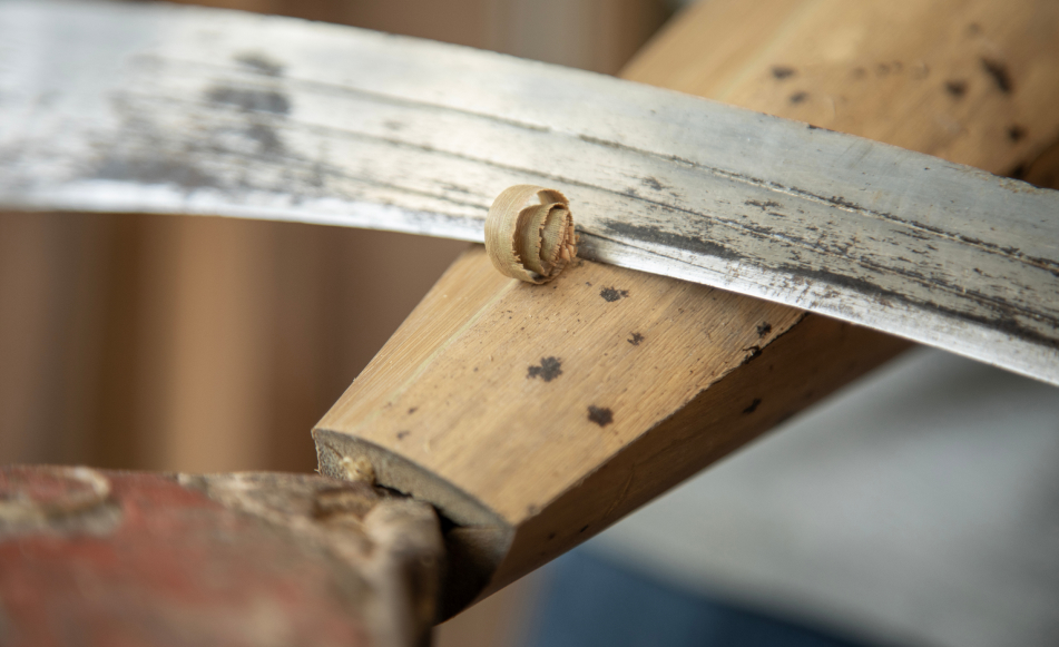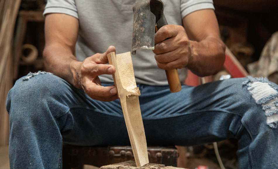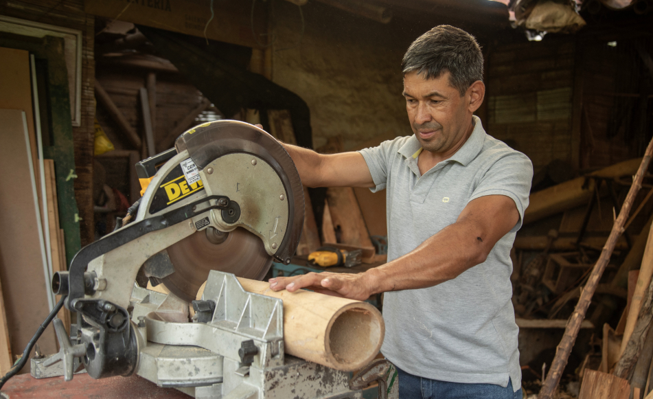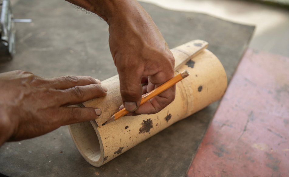 Salento le ha ofrecido el paisaje perfecto para desarrollar su trabajo artesanal pues vive entre guaduales. Es un maestro del corte de esta materia prima y experimenta con ella haciendo calados y ensamblando sus piezas con maestría. Han sido años de exploración de la madera para llegar a su dominio y la comprensión de su comportamiento en distintos climas… lo dice porque recuerda cuando trajo sus primeras piezas a Bogotá, y el clima frío y seco hizo que se desprendieran y rajaran. También tiene clara la diferencia de trabajar con madera inmunizada para la buena vida del producto. Cuando repasa su camino se da cuenta de que sí que ha crecido.