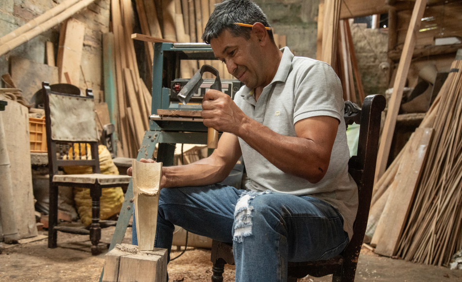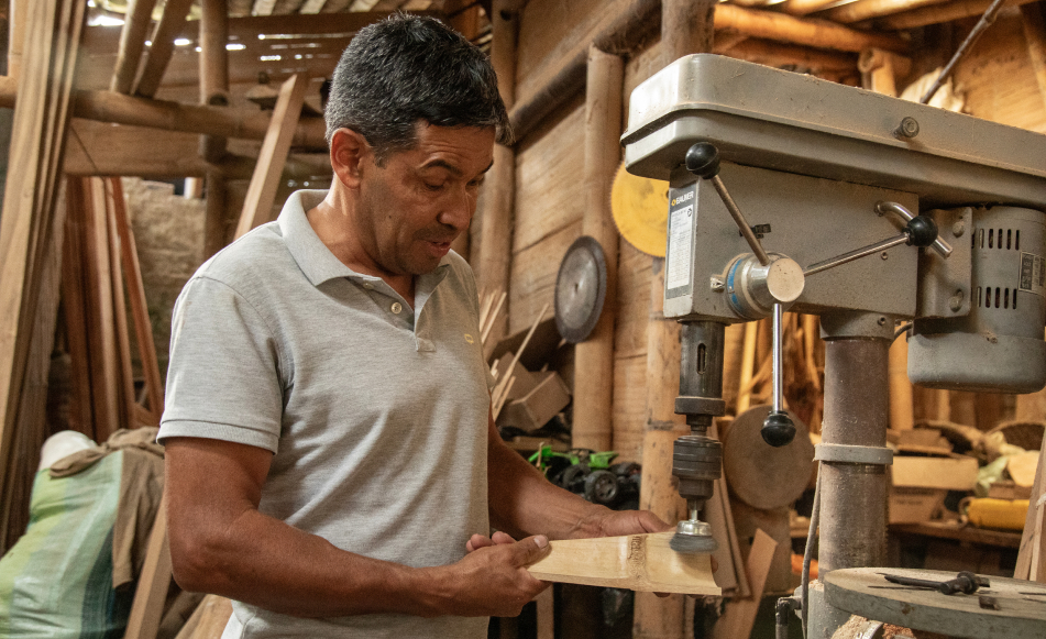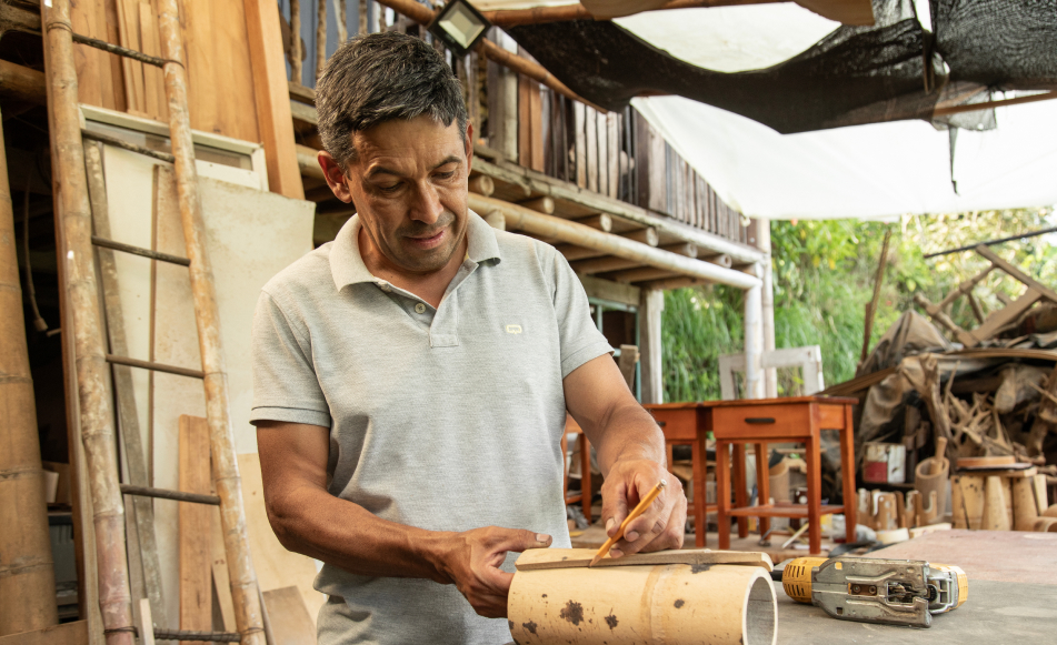 Esos años de la adolescencia en nueva tierra le hicieron pasar dificultades porque ya no contaba con los pesos de la minería que le daban alguna libertad en Quinchía. Sin ese estímulo y sin muchas ganas de sentarse en un aula, se concentró entonces en aprenderle a su papá todo el trabajo de construcción con guadua. Luego se metería a cuanto curso hubiera para especializarse en este campo. Y para hacerse un dinero extra, hasta trabajó en una que otra discoteca. Sin embargo, finalmente encontró que el turismo sería su mejor aliado y, más aún, la guadua de toda su vida. Terminó asociándose con el dueño de un hotel que vio en la artesanía un camino para recuperar las inversiones que el conflicto ponía en entredicho. Con él, al pie del Parque del Café, se hicieron a las herramientas necesarias y terminó de aprender lo que necesitaba aprender para declararse artesano de pura cepa.