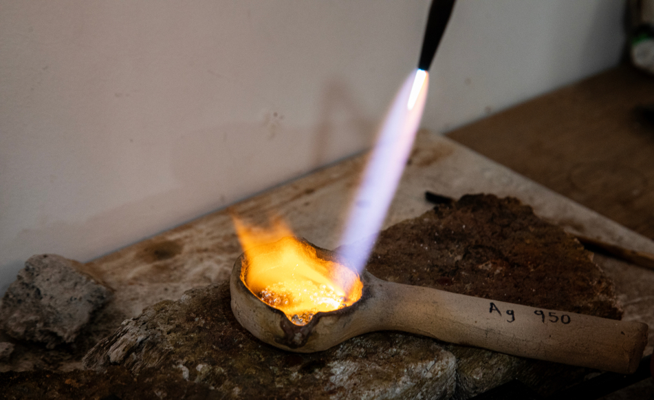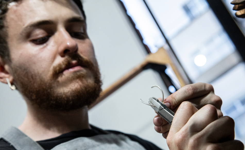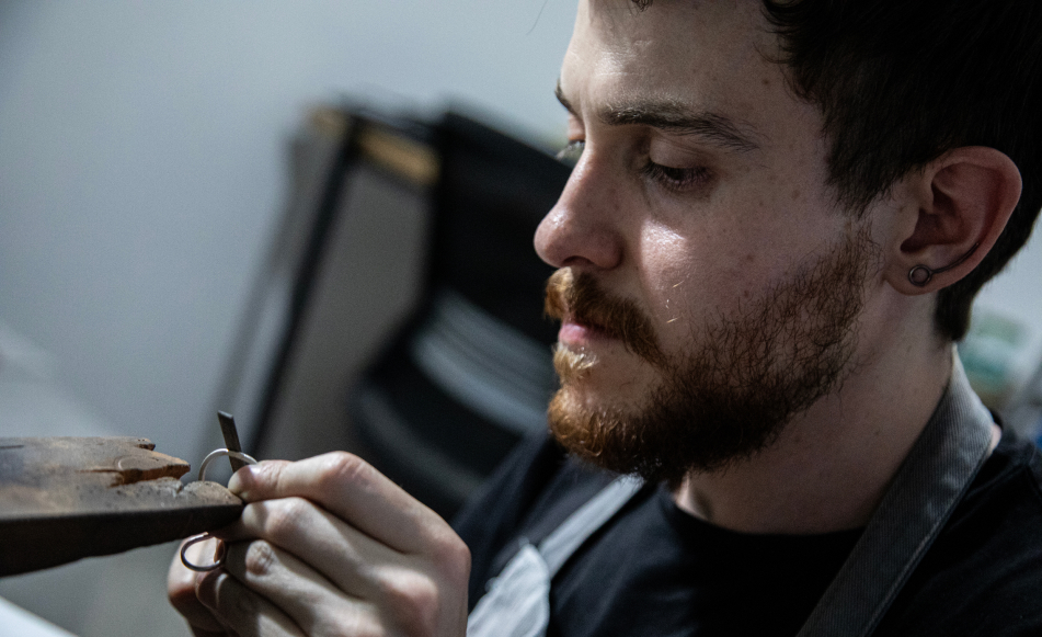 Desde antes de terminar la carrera de Arquitectura, Juan David se dió cuenta de que eso no era a lo que se quería dedicar. Lo único que disfrutaba de la disciplina, en ese momento, era el hacer cosas con las manos; cortar, pegar y ensamblar maquetas. La idea de pasar los días sentado frente a un computador diseñando proyectos no le llamaba para nada la atención, y en un golpe de instinto, decidió inscribirse a todas las electivas de artes que pudo. Así conoció la joyería, oficio en el que lleva ya sumergido ocho años. Fue tal la conexión, que de inmediato le pidió prestado el taller a su amigo Jesús Suárez. Usaba sus herramientas y aprendía bajo su instrucción. Luego, crearían juntos la marca Lastra, de la que Jesús hizo parte hasta hace tres años, cuando decidió virar y dedicarse a la cerámica.