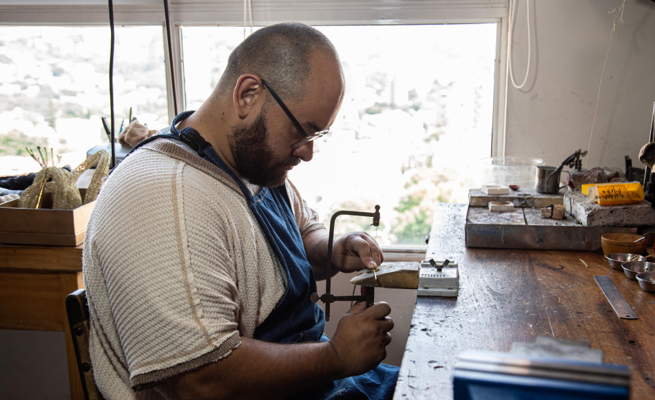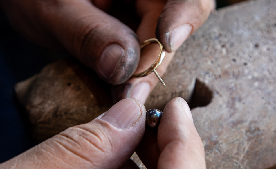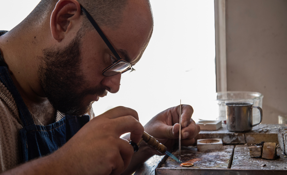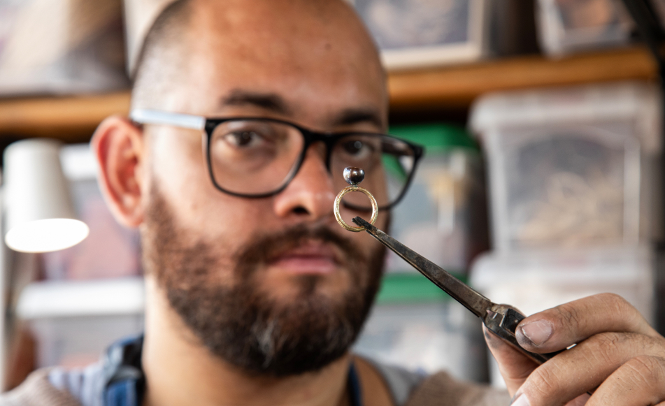 Con el tiempo, cambió la playa de la infancia por las ferias artesanales, el nuevo lugar donde descubrir materiales para nutrir su colección de tesoros por usar, su suerte de biblioteca personal. Gracias a esa entrega y sintonía, crea piezas que se vuelven amuletos para quien las usa, y que lo han sido para él mismo, pues le han mostrado lo amplia que se puede volver la joyería que no se enmarca en un género, sino que expresa una identidad.