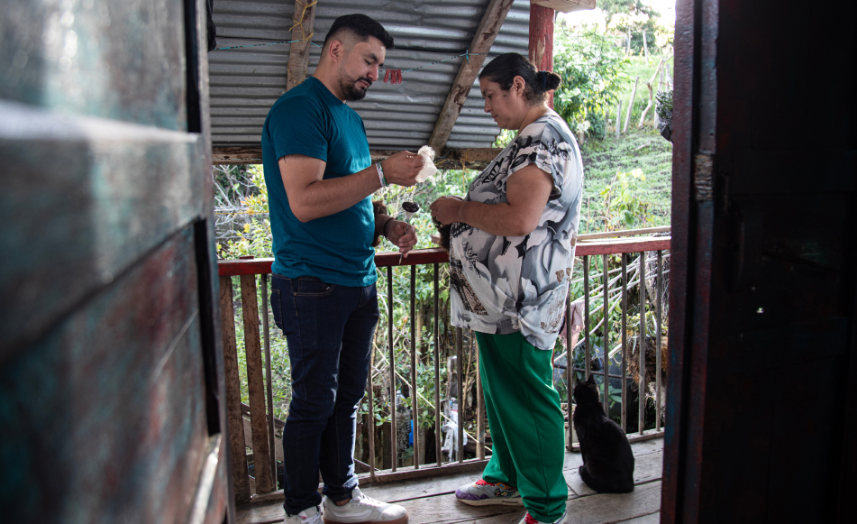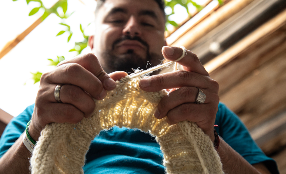 Ahora que lo recuerda, cae en la cuenta de que en todos sus viajes laborales compraba alguna artesanía para llevarle a la familia de recuerdo. El amor por el oficio ya lo tenía. Como cuando de niño le pidió a la abuela Rubiela que le enseñara a tejer en crochet. Esa vez no lo logró, quizá no era el momento. Lo sería cuando llegó a vivir con sus abuelos en Sonsón a los trece años, cuando su madre, Consuelo Marín, decidió sacarlo de la vereda San José de las Cruces para alejarlo del reclutamiento forzado, los secuestros, las armas y la muerte que rondaban sus tierras a comienzos de los dos mil. Lo mandó al pueblo confiando en los valores que le había enseñado y en que los abuelos lo guiarán cuando tuviera que decirles que no a los ilegales. Yeison, quien ya había visto cómo su propio padre y tres tíos habían sido reclutados por distintos grupos, aprendió que, si iba a haber justicia, no debía ser con un arma en mano. Así que en Sonsón se puso a estudiar y a trabajar, primero en un granero y luego en una funeraria, trabajo que le ayudaría a reconciliarse con tanta muerte, una inquietud que luego lo llevaría a trabajar en desminado humanitario. Qué curioso como todo lo llevó a su propia sanación y reparación.
