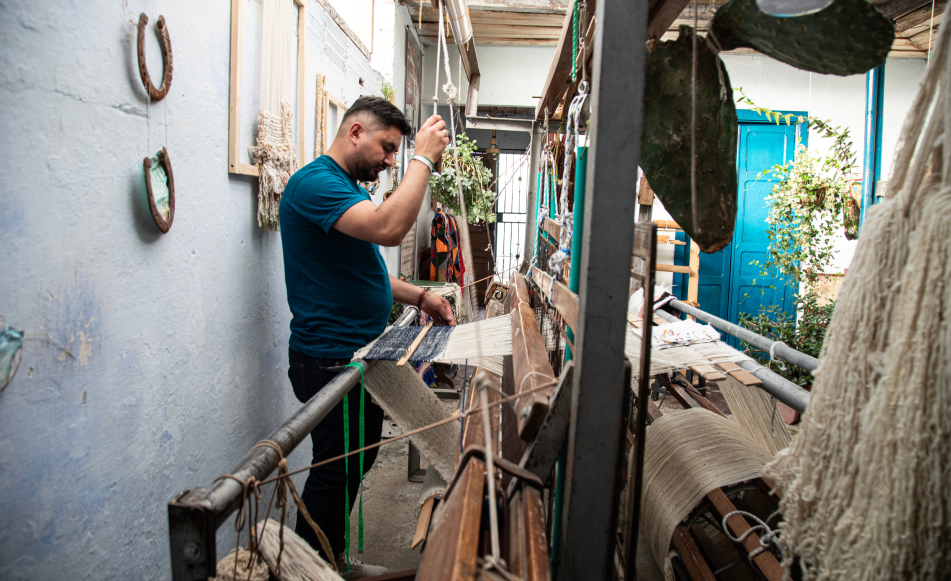 Yeison se propuso recuperar esos saberes. Gracias al curso que tomó en la Casa de la Cultura, empezó a buscar respuestas. Se subió a los zarzos de las casas de su familia, se aventuró a los cuartitos de atrás, y se encontró tesoros: el bastidor vertical de 150 años que había pertenecido a su tatarabuela Rosana Granada, el de 67 años que guardaban sus tías, y el de 47 años. Se le vino a la mente el recuerdo de sus tías escondiendo los telares de la vista de los niños y los hombres, por la creencia de que si los miraban se iban a avinagrar los tejidos, como la comida, y cayó en la cuenta de no había quién heredara la tradición de las tejedoras de su familia, pasada con tanto recelo de generación en generación. Decidió ser él. Les empezó a preguntar por su historia a las mujeres, volvió a armar los telares, y hasta recibió en comodato el telar horizontal de las primeras clases, que ahora usan él y la comunidad de tejedoras en el patio de la casa de su abuela. Así, en 2024 abrió su taller, al que le puso Maitamá Tejidos Ancestrales después de oír a su sobrina llamarle “maíta” a su abuela, y de descubrir que Maitamá había sido un cacique de la región. Instaló en la casa familiar su colección de máquinas prodigiosas; eso le permite cuidar de sus mayores al tiempo que teje, en un ejercicio importantísimo por recuperar el oficio que la violencia casi les quita. Tras un largo camino, Yeison regresó a casa para honrar, día a día, a las mujeres que lo criaron, cuidando de su salud, manteniendo vivo el oficio, y enseñándoselo a quienes lo perpetuarán.