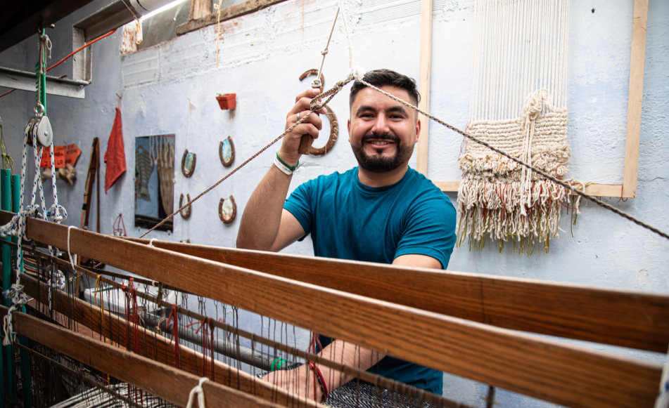 La primera vez que Yeison Marín estuvo frente a un telar, durante una clase impulsada por Antioquia Mágica en la Casa de la Cultura de Sonsón en 2022, sintió tanta ansiedad al ver los miles de hilos delgados con los que estaba cargado, que le dieron ganas de salir corriendo. Esa tarde volvió a la casa y le dijo a su abuela que él por allá no volvía. Sabía de gestión de talento humano, había trabajado como asistente y administrador para la Halo Trust, haciendo desminado humanitario en el Putumayo, Casanare, Boyacá y Norte de Santander; y no sabía de nada que requiriera de trabajo artesanal. Pero entonces su abuela Rubiela le mostró un tapetico y le dijo que si ella, a sus 74 años, había aprendido a tejerlo, él podría aprender perfectamente a manejar un telar. Entonces se puso una nueva meta, se dijo: si la clase no me gusta, al menos voy a entender cómo funciona esta máquina. Y así lo hizo. Llegó a la siguiente sesión con cuaderno en mano, dibujó las líneas del telar, anotó todo sobre los pedales, su orden, y los códigos de los hilos. Cuál no sería su sorpresa cuando, gracias a haberlo registrado todo en su cuaderno, lo dejaron encargado cuando la maestra se devolvió para Medellín. Era el más joven del grupo, un hombre entre tantas tejedoras sonsoneñas.