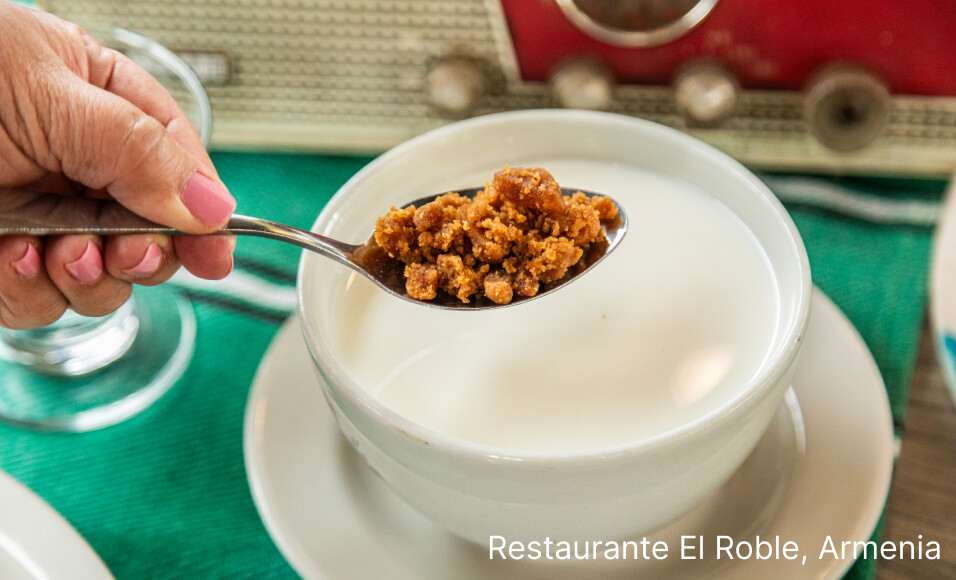 A la hora de llegar a Armenia, tierra de -cuyabros (gentilicio adoptado de la fruta cuyabra y que es nativa de la región)- los chorizos cocidos de doña Mirita en el restaurante El Roble son divinos para el paladar. Se cocinan con un guiso de tomate y cebolla, y se sirven con papa; y si lo prefieres, di que te lo sirvan en una tacita con una cucharada de arroz. Otra opción es la bandeja paisa que presentan bastantes típicos con arepas, hogao, limones y mantequilla. Y no te puedes ir sin probar la popular mazamorra, un alimento de consistencia espesa. ¡Pa’ chuparse los dedos!