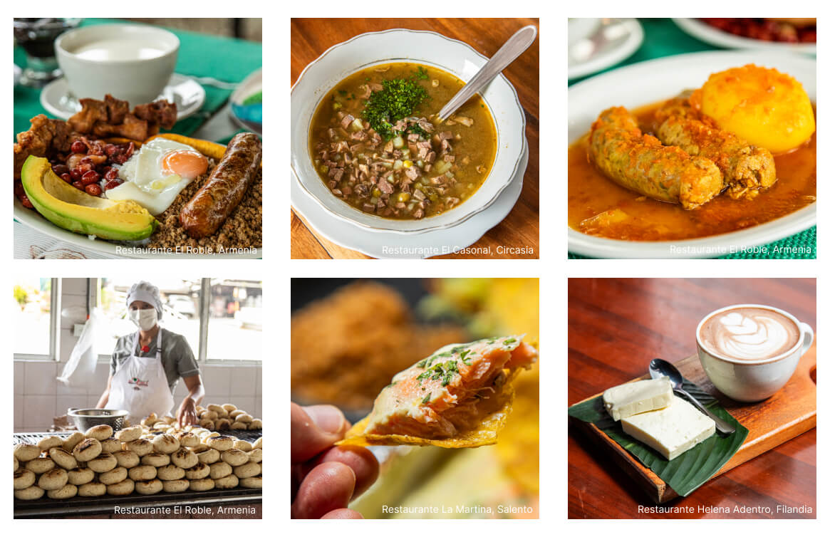 Estás en la capital del departamento, hogar del imponente Museo del Oro Quimbaya, un lugar al que no puedes dejar de ir no solo por el patrimonio que resguarda sino porque su edificio fue realizado por el arquitecto Rogelio Salmona. Desde esta ciudad de clima agradable será muy fácil moverte por todos los municipios que te proponemos porque están muy cerca el uno del otro (si llegas por Pereira puedes reconfigurar el recorrido llegando primero a Filandia y luego puedes seguir a Salento y a Circasia, pasar por Armenia y terminar en Quimbaya). Aquí visita los talleres de Ana Delia Barahona, artesana que trabaja con cáscara de huevo; la alfarera Aminah Koradi; el marroquinero José Alejandro Bautista y el joyero Luis Leonardo Domínguez. Y dos paseos imperdibles a tan solo media hora de la capital: el Parque del Café y el Jardín Botánico del Quindío (vía a Calarcá). Y aunque los municipios que te mencionaremos a continuación no están dentro de la Ruta, ¡también tienen diversos atractivos y puedes salir desde la capital! La Tebaida se ha convertido en un corredor gastronómico del departamento; en Pijao, conoce los frailejones en el precioso Páramo de Chilli; en Génova, prueba su gran café y visita la Laguna de Juntas; en Córdoba visita las cascadas de Río Verde. Y de Buenavista es el famosísimo Café San Alberto, ¡pruébalo en su casa!